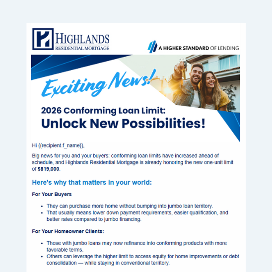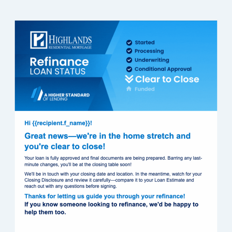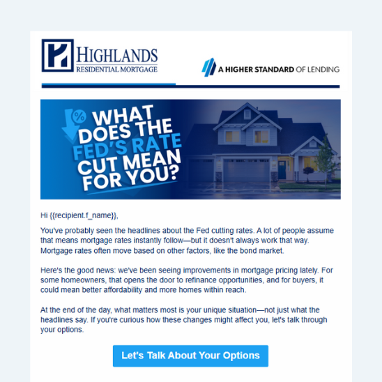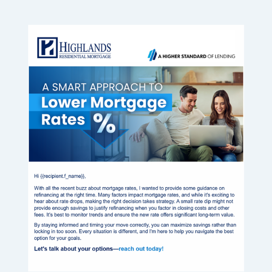With rate conversations happening daily, this email helps borrowers slow down, evaluate true savings, and approach refinancing strategically. It builds credibility, creates trust, and opens the door for deeper conversation any time the market shifts.