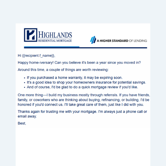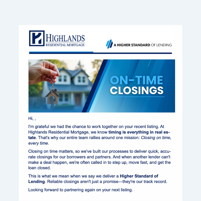 Built to nurture relationships with listing agents on your funded loans. Messaging reinforces partnership, collaboration, and results. Agents are added at closing (one-time entry).