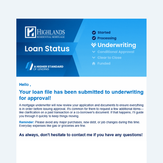 A loan progress experience borrowers actually appreciate. These updates set expectations, reduce uncertainty, and streamline communication from application to closing.