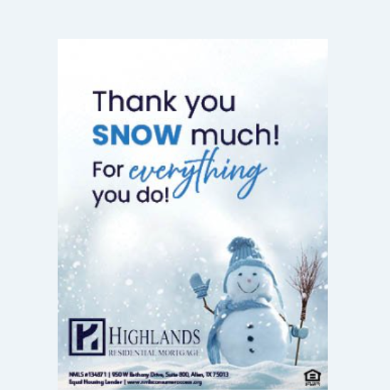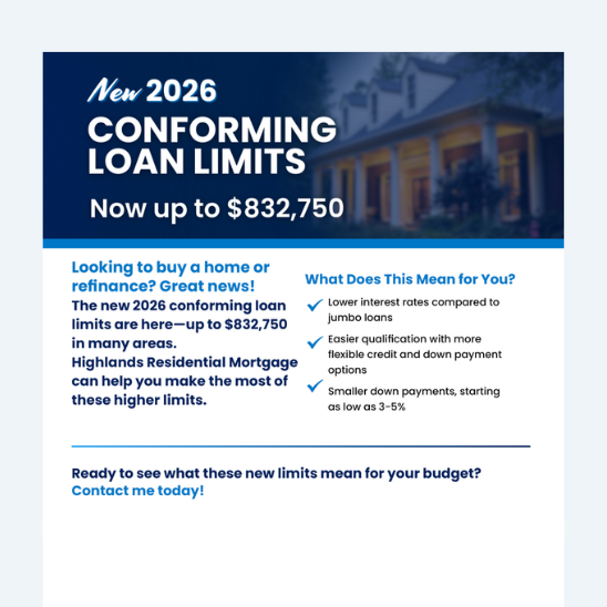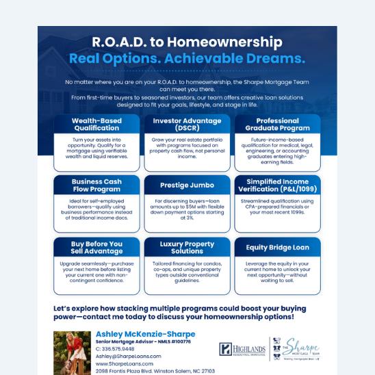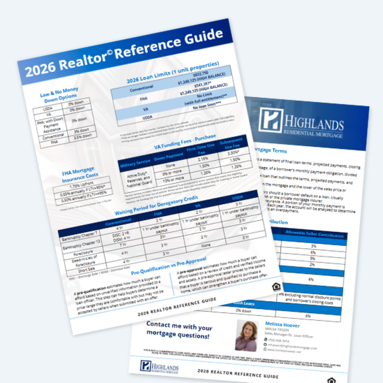 A clean, easy reference that outlines Highlands’ full range of loan options from Conventional, FHA, VA, and USDA to Non-QM and renovation programs. Ideal for clients and referral partners who want a quick snapshot of what we offer. Also, it’s a great recruiting tool!