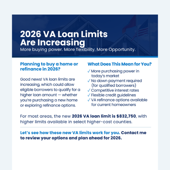 A two-page, real estate agent-friendly guide covering loan limits, down payment options, funding fees, credit timelines, and seller contributions. A great leave-behind or quick reference that they can keep on hand.